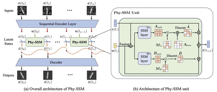 Framework for the proposed Phy-SSMThis work aims to address the problem of long-term dynamic forecasting in complex environments where data are noisy and irregularly sampled. While recent studies have introduced some methods to improve prediction performance, these approaches still face a significant challenge in handling long-term extrapolation tasks under such complex scenarios. To overcome this challenge, we propose Phy-SSM, a generalizable method that integrates partial physics knowledge into state space models (SSMs) for long-term dynamics forecasting in complex environments. Our motivation is that SSMs can effectively capture long-range dependencies in sequential data and model continuous dynamical systems, while the incorporation of physics knowledge improves generalization ability. The key challenge lies in how to seamlessly incorporate partially known physics into SSMs. To achieve this, we decompose partially known system dynamics into known and unknown state matrices, which are integrated into a Phy-SSM unit. To further enhance long-term prediction performance, we introduce a physics state regularization term to make the estimated latent states align with system dynamics. Besides, we theoretically analyze the uniqueness of the solutions for our method. Extensive experiments on three real-world applications, including vehicle motion prediction, drone state prediction, and COVID-19 epidemiology forecasting, demonstrate the superior performance of Phy-SSM over the baselines in both long-term interpolation and extrapolation tasks.